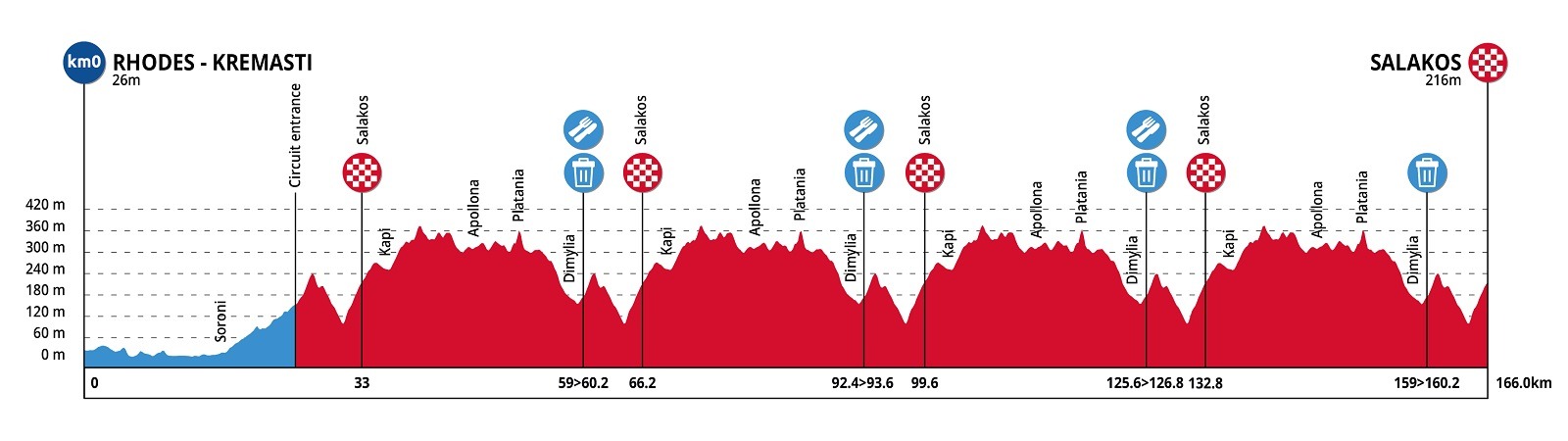 Tras la salida desde la propia ciudad de Rodas y un breve tramo inicial en línea recta, se entrará en el circuito final de 33,2 kilómetros, que se repetirá cuatro veces y se caracteriza por varios ascensos y descensos, entre ellos una subida de poco más de 2000 metros que llevará a la meta de Salakos, donde podrían disputarse la victoria aquellos corredores dotados de cierta resistencia y explosividad.