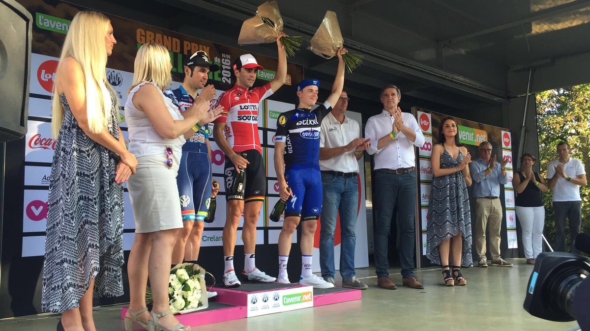 Tony Gallopin (Lotto) por fin volvió a ganar un año y medio después de una etapa en la París-Niza 2015 en el 56º GP Valonia belga tras ser segundo en la pasada Clásica de San Sebastián y cuarto en el Tour Britain. Y por centímetros porque aguantó el poderoso sprint final del excmpeón checo Petr Vakoc en la línea de meta. El francés atacó en la subida final de la fortaleza de Namur y cuando vio acercarse al corredor del Etixx aceleró lo suficiente para poder levantar sus brazos por primera vez en 2016. Jerome Baugnies (Wanty) completó el podio e Iván García Cortina, aprendiz con Etixx, terminó la carrera.