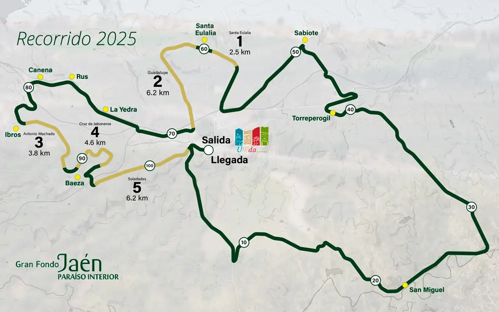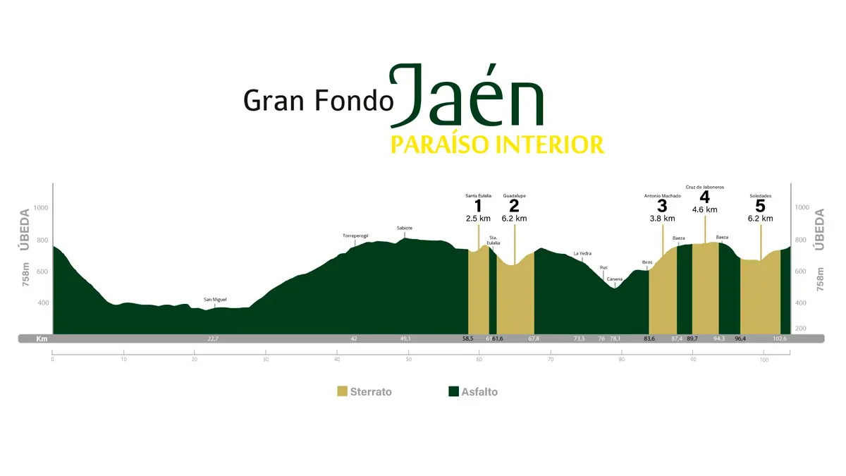 La tercera edición de la Gran Fondo Jaén Paraíso Interior partió y concluyó en Úbeda, ciudades Patrimonio de la Humanidad, tal y como lo hará la Clásica profesional. Constaba de 93 kilómetros, 33 de ellos correspondientes a tramos de ‘sterrato’.