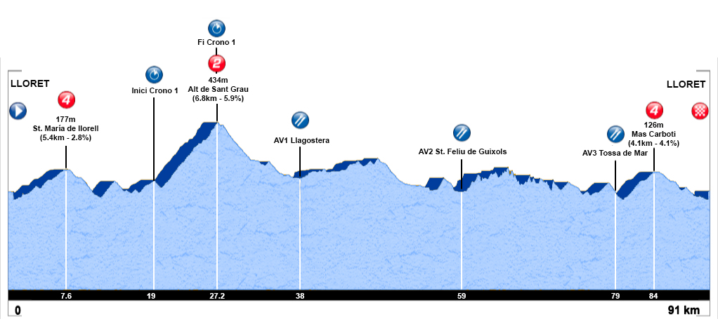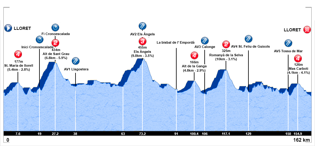 Este trazado contará con un total de seis puertos. Dos de ellos, el Alto de Sant Grau y Romanyà de la Selva, de segunda categoría; Los Ángeles, de 3ª categoría y Santa María de Llorell, el Alto de la Ganga y Mas Carboti, de cuarta categoría.