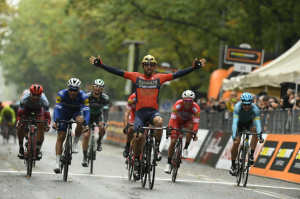 Con la lluvia como compañera también en los últimos kilómetros, fueron los italianos del Bardiani-CSF quienes dominarían la situación tras atrapar a los fugados. Julien Vermote (Dimension Data) fue el primero en intentar sorprender al grupo con un ataque en solitario, pero sin apenas margen. A poco más de dos kilómetros de la línea de meta, al paso por una rotonda, Mirco Maestri, quien en ese momento estaba liderando al grupo, se deslizó y cayó al suelo sin incidencias pero sirvió como precaución para el resto, justo antes del ataque, de nuevo, de Jens Keukeleire. El belga, que logra extender aún más el grupo de velocistas, permaneció en cabeza para anticipar el sprint, pero Koren, con un gran lanzamiento, estiró el grupo para que su compañero Colbrelli tuviera a su disposición la posición ideal para batir al resto como su movimiento más característico, un sprint potente lanzado a más de 300 metros sin dar opción a su rivales, inapelable.