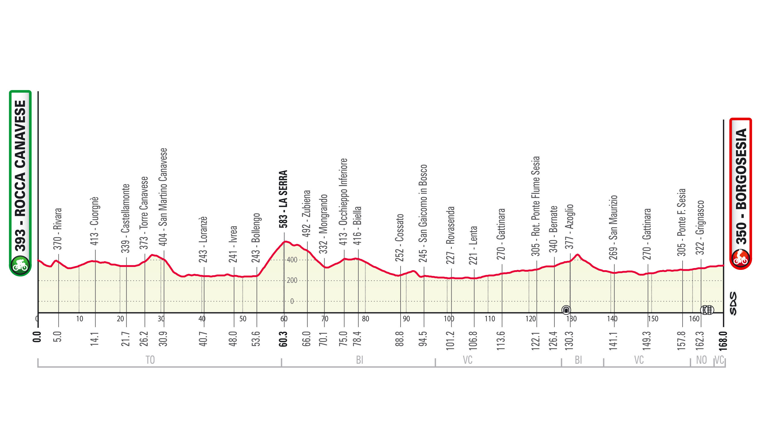 La 105ª edición del Gran Piamonte (jueves 7 octubre) discurre por una ruta sustancialmente llana desde Rocca Canavese hasta Borgosesia. El recorrido atraviesa las ondulaciones de la zona del Canavese y sube la Serra después de Ivrea. A continuación, desciende hacia Biella y, tras haber tocado los Prealpes, llega a los valles de Valsesia, donde tiene lugar el final de la carrera con un circuito de unos 35 km. Los corredores entrarán en el circuito por Gattinara y luego pasarán cerca de Borgosesia tras cruzar primero al otro lado del río. A continuación, abordarán suaves ondulaciones cerca de Azoglio antes de volver a Gattinara y, desde allí, a la meta de la carrera en Borgosesia. Los últimos 5 kilómetros son de subida constante por carreteras de anchura media antes de la recta final.