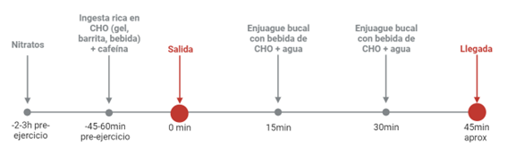¿Y durante la prueba? Pues debido a su duración menor a 1h, las ingestas de alimentos sólidos ricos en carbohidratos no son recomendadas. Pero si que podría ser de utilidad realizar enjuagues bucales con líquidos ricos en carbohidratos (glucosa, maltodextrinas) de forma frecuente durante la prueba. Esta estrategia consistiría en enjuagarse la boca durante 5-10 segundos y expulsar el líquido rico en carbohidratos (3). Esta estrategia ha demostrado un potencial efecto positivo (+2-12%) en el rendimiento sin la necesidad de ingerir el líquido, evitando por tanto los posibles problemas gastrointestinales.