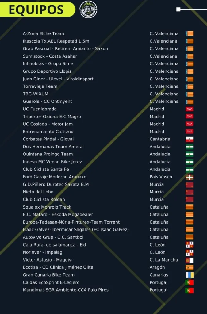 Calpe, Xàbia y Altea serán los pueblos en donde los días 7, 8 y 9 de marzo se celebrará la I Vuelta Ciclista Costa Blanca, en categoría cadete, con la participación de más de 200 corredores pertenecientes a 36 equipos de España y Portugal (diez de la Comunitat Valenciana, cuatro de Andalucía, uno de Aragón, uno de Canarias, uno de Cantabria, uno de Castilla-La Mancha, tres de Castilla-León, cinco de Cataluña, cuatro de Madrid, tres de Murcia, uno del País Vasco y dos de Portugal), según informa el portal «Alicante con el plato grande».