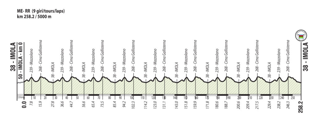 La carrera constará de 9 vueltas (258,2 km.) a un circuito de 28,8 kilómetros que, si bien no tiene subidas largas, sí que ofrecerá dos exigentes ‘repechos’ de casi tres kilómetros en los que los ciclistas se encontrarán rampas de hasta el 14%. Serán alrededor de 5.000 los metros de desnivel positivo que se acumulen al final de un Campeonato cuya dificultad también residirá en lo estrecho de algunos tramos de carretera y en la falta de descanso dado el continuo sube y baja.