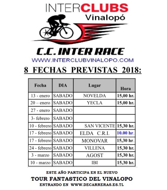 Interclubs Vinalopó 2018: El calendario en Comunitat Valenciana 09/11/2017 0El próximo 13 de enero comenzará una nueva edición, la número 10, del Interclubs Vinalopó. De momento hay ocho fechas confirmadas, entre ellas la de Yecla, que debutará en el calendario.ReglamentoClasificaciones edición 2017Calendario provisional 2018 interclubs vinalopó 2017-11-09Rafa Mora tweet