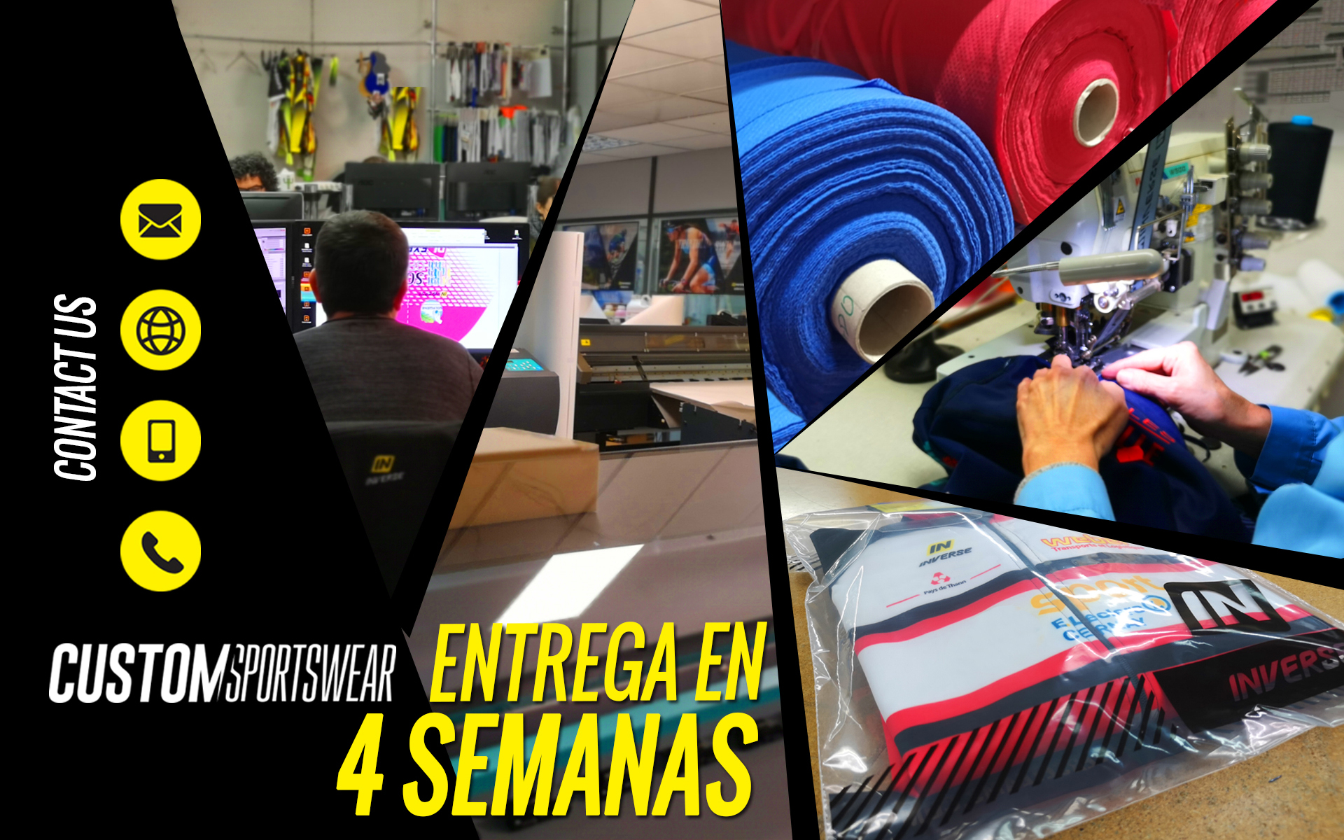 Inverse ha mejorado y modernizado su linea de producción para ganrantizar las entregas en 4 semanas de todos sus pedidos de ropa personalizada de ciclismo, triatlón, running, trail running y sky. La entrega en 4 semanas se garantiza una vez el cliente haya aceptado la oferta y haya validado el diseño presentado por nuestro departamento de diseño.