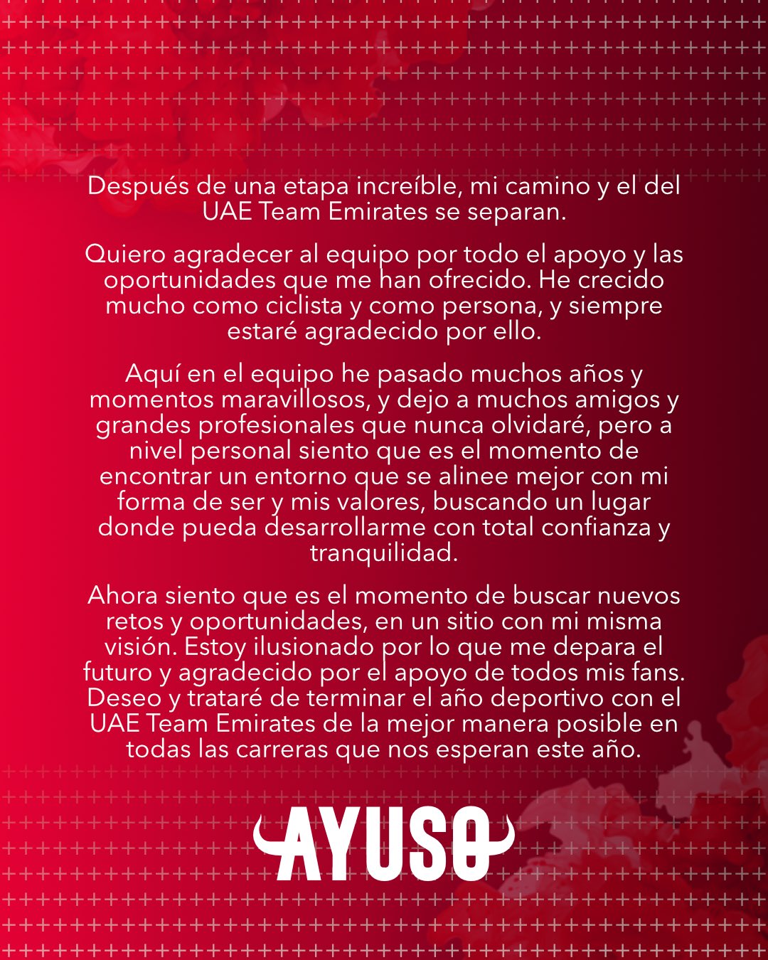 Por último, Juan Ayuso se pronunció a través de un comunicado compartido en sus redes sociales. El ciclista siente que «a nivel personal» llega «el momento de encontrar un entorno que se alinee mejor» con su «forma de ser y valores, buscando un lugar donde pueda desarrollarse en total confianza y tranquilidad».