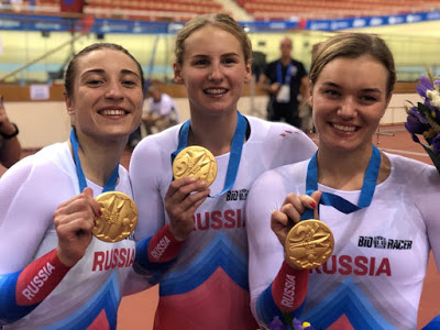 Pasando a las persecuciones por equipos, los rusos (Sytitsa, Bersenev, Gonov y Smirnov), que habían sido los más rápidos en la clasificatoria (3:55.201), mejoraban su tiempo en la primera ronda matinal (3:53.104), para medirse en la final a una Italia (Bertazzo, Lamon, Moro y Plebani) que ese enfrentamiento decisivo estuvo por debajo de lo esperado y se veía doblada por la cuarteta rusa que, no olvidemos, está integrada por ciclistas de 19 y 20 años. Suiza completaba el podio al derrotar a Bielorrusia.
