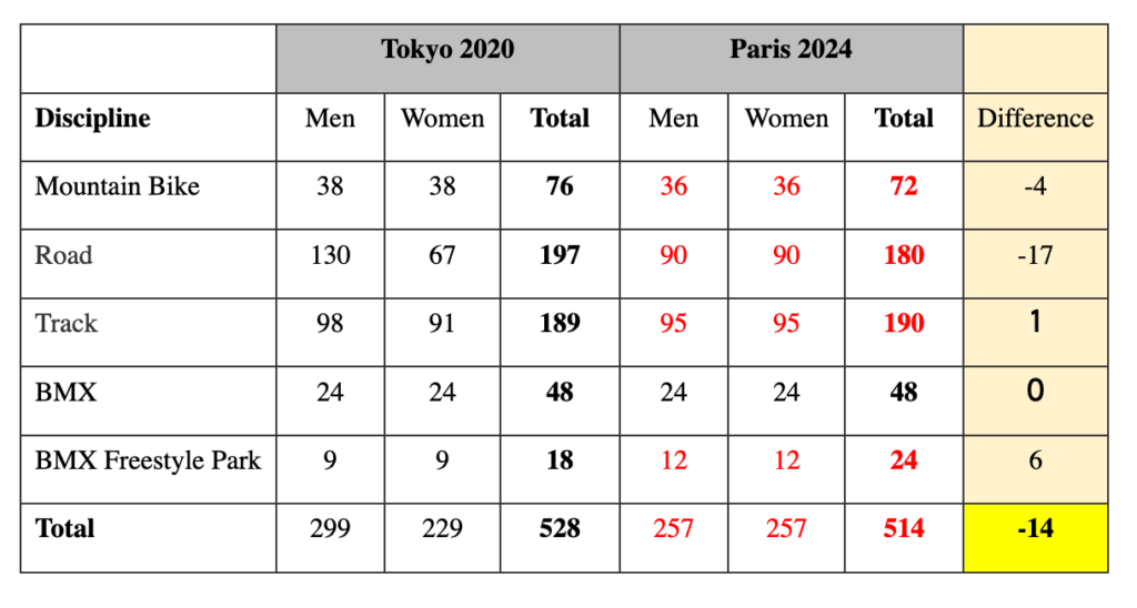 Cabe señalar que este importante avance se produce en un momento en que se está reduciendo el número de atletas que participan en los Juegos en los distintos deportes, de conformidad con las recomendaciones de la Agenda Olímpica 2020 del COI. Así, el ciclismo tendrá 14 plazas menos en París 2024, reducción que afecta a la bicicleta de carretera y de montaña. Esta disminución moderada se compensará en parte con la asignación de una plaza adicional para el ciclismo de pista y seis en el BMX Freestyle Park, con lo que el número de atletas que compiten en las pruebas de estilo libre tanto masculinas como femeninas pasará de nueve a doce.