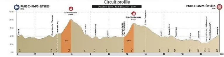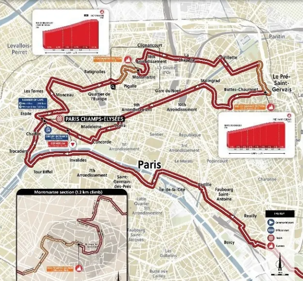 El medio italiano La Gazzetta dello Sport ha adelantado el perfil y el recorrido del circuito final de la prueba en ruta de los próximos Juegos Olimpicos. La prueba terminará, al igual que el Tour de Francia, en los Campos Elíseos, aunque en este caso lo hará con un bucle de 22 kilómetros que incluye dos breves ascensiones. El pelotón masculino dará ocho vueltas a este recorrido al que se llega desde el sur, tras cruzar el río Sena. La primera dificultad que puede favorecer los ataques es el ascenso a Montmartre, de apenas 1,2 kilómetros, pero con pendientes cercanas a los dobles dígitos. Tras el descenso y antes de virar hacia meta, se afronta Le Pré Saint Gervais, de 800 metros y rampas más suaves.