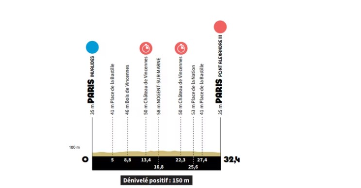 Después, el circuito de la contrarreloj se dirigirá al Polígono de Vincennes, una zona extremadamente popular para los aficionados al ciclismo de París. Y finalmente, al Instituto Nacional del Deporte y el Rendimiento (INSEP), que marcará el punto de retorno.