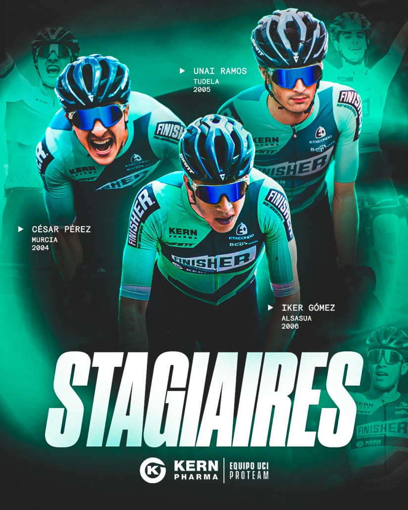 El Equipo Kern Pharma continúa mirando al futuro a través de su filial, el Equipo Finisher, y desde este verano añadirá a su plantilla a tres ciclistas para seguir formándose entre profesionales. Iker Gómez, César Pérez y Unai Ramos serán los aprendices del conjunto navarro hasta final de temporada.