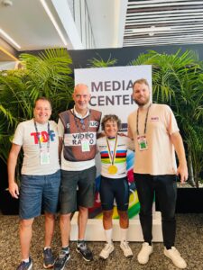 Por fin no estoy solo. Llega Daniel Miranda por el diario As mientras Nacho Labarga de Marca me cuenta que ya anda por allí. Los tres medios españoles amén de Carlos Pizarro –otro español de Valencia residente en París y que trabaja para Radio Francia Internacional- y Eurosport en la zona mixta. Nadie más. Y enseguida nos pusimos a trabajar con la rueda de prensa del nuevo presidente Lappartient -que aprovechó para arremeter contra España mintiendo sobre Pedro Sánchez y su gobierno-. Pero la mañana prometía y así fue. Paula Ostiz, tras su pequeño disgusto con la plata contrarreloj, se proclamaba campeona del mundo júnior de fondo en carretera por primera vez en la historia. A diferencia de Blasi, estuve en la meta en previsión del oro de la navarra. No me equivoqué y compartí el clímax de Ostiz y el resto de la selección que vibraron y lloraron -especialmente las compañeras de Ostiz como la valenciana Almena– en un momento histórico del ciclismo español. Eusebio Unzue -su próximo mánager en el Movistar 2026– la felicitaba, al igual que las elites españolas que llegaban justo en ese momento al box español antes de su meta. Y entre ellas Mavi García. Podio especial, el himno de España -única vez que lo escucharon los ruandeses- y el protocolo. Ostiz, con su brillante medalla de oro y su maillot blanco con los aros olímpicos llegó a la sala de prensa que ya conocía por su plata. De momento no sabe inglés así que tocó traducción con el móvil del responsable de prensa y una pregunta de una colega ruandesa que costó descifrar. Alegre y tranquila a la vez, Ostiz nos habló a As, Radio Francia y Ciclo 21. Y tampoco pudimos evitar otra instantánea con la ciclista española que más promete. Y después mensajes coincidentes en mi whatsapp. «Te he visto en la tele». Un clásico.