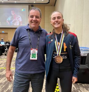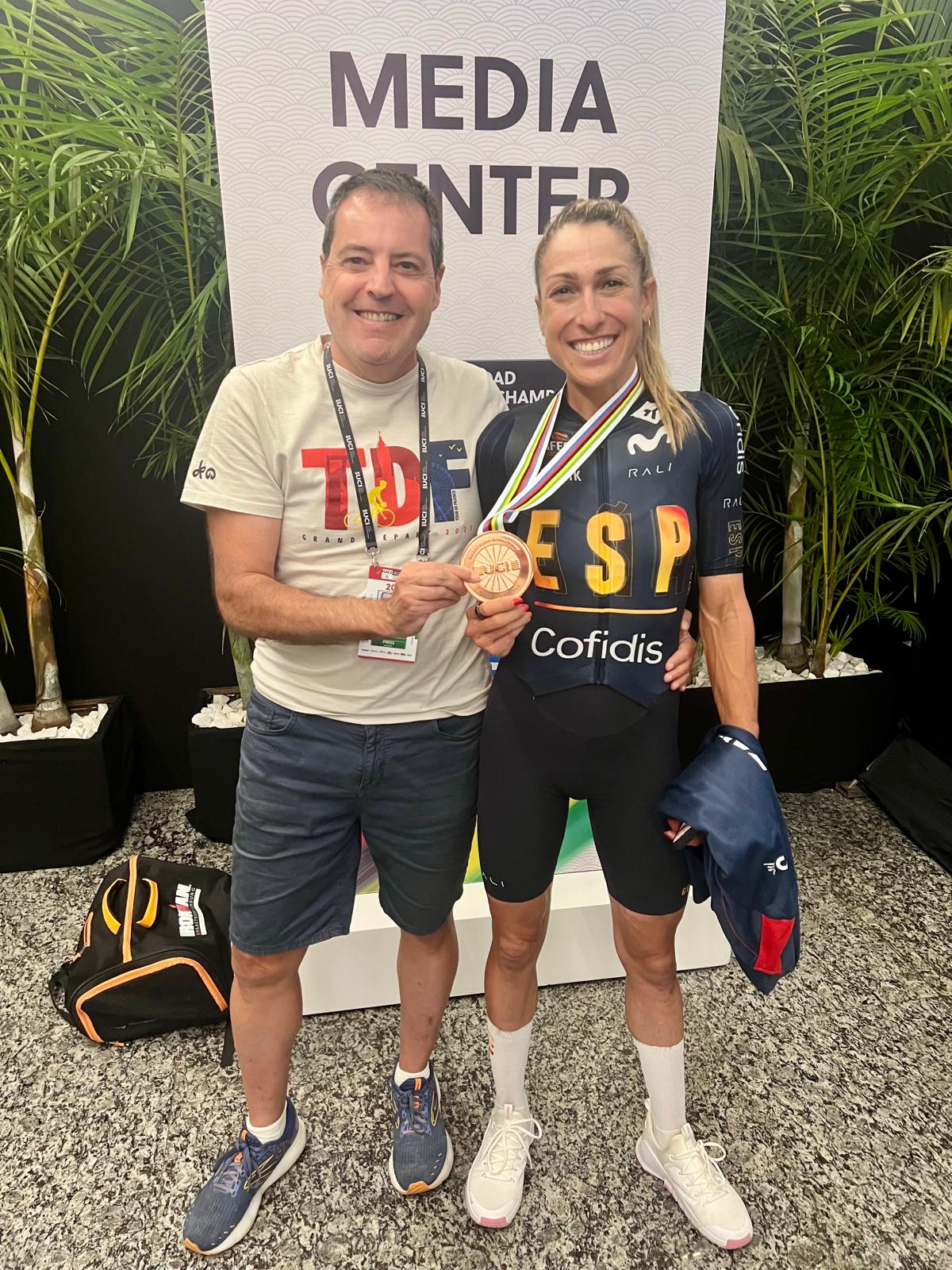 Pasado el carrusel de emociones y la crónica de un oro -siempre inspira y motiva más- llegaron las féminas elite donde las esperanzas no eran muy optimistas a pesar de la buena preparación de una Mavi García que en la víspera anunció en primicia a Ciclo 21 que seguía un año mas y esta vez sí el último. «Puede pasar cualquier cosa» me dijo y no le faltó razón. Salgo al circuito y me cruzo con la excampeona estadounidense Ruth Winder -me niego a usar su Edwards de casada-, a la sazón sobrina de mi amiga cicloturista Anne Barton a quién conocí en Valencia cuando venía a entrenar con el Sunweb 2018. Disfruto del ambiente -después de discutir con el controlador a la zona de aficionados y regreso- y los pasos por meta con las españolas bien colocadas. Los chavales disfrutan con el espectáculo ávidos de algún bidón volador de souvenir, mientras otros aprovechan las pantallas gigantes para no perder ripio de la carrera y aplaudir cada paso. Ambientazo. Las favoritas se relajaron o se bloquearon -como por ejemplo en Tokio con Kiesenhofer- y Vailleres, Fisher-Black y García lo aprovecharon. A sus 41 años -la más veterana que no vieja del grupo- la mallorquina culminaba su carrera con el podio y el bronce, que nunca es una victoria, pero sí para ella teniendo en cuenta cómo discurrió la carrera y su pugna perenne por un día como este. La espero en meta. Se abalanzan sobre ella como si hubiera ganado el oro. La felicito y me responde con ironía «mira la vieja me llamabas» por lo de veterana en la previa. Es su gran día. Saluda, salta, sonríe más que la sorprendente campeona canadiense. Y reconozco que su éxito me alegró más de lo que debe un periodista que, en mi opinión no debe tener amigos en el pelotón. No lo soy de García Cañellas, pero la conocí siguiendo en moto el Campeonato de España de 2016 en Cocentaina donde ganó en solitario por delante de la favorita local Anna Sanchis. Allí fue mi primera entrevista y hasta este 2025 al menos ocho más gracias a sus victorias en el TOP Ciclo 21 como mejor española del año que tengo el honor de entregar cada año. Así que nuestras citas son frecuentes siempre con exquisita atención como la profesional que es. Salté cuando gano su etapa del Tour de Francia y mi entorno sabe que dije que iba a Ruanda, entre otras cosas, a ver a Mavi García en el podio pensando que iba a ser el último. Por suerte no me equivoqué y pude disfrutar profesionalmente de otro momento único con foto incluida para un recuerdo imborrable. La cuarta presea española, todas femeninas y la última aunque no lo sabíamos.