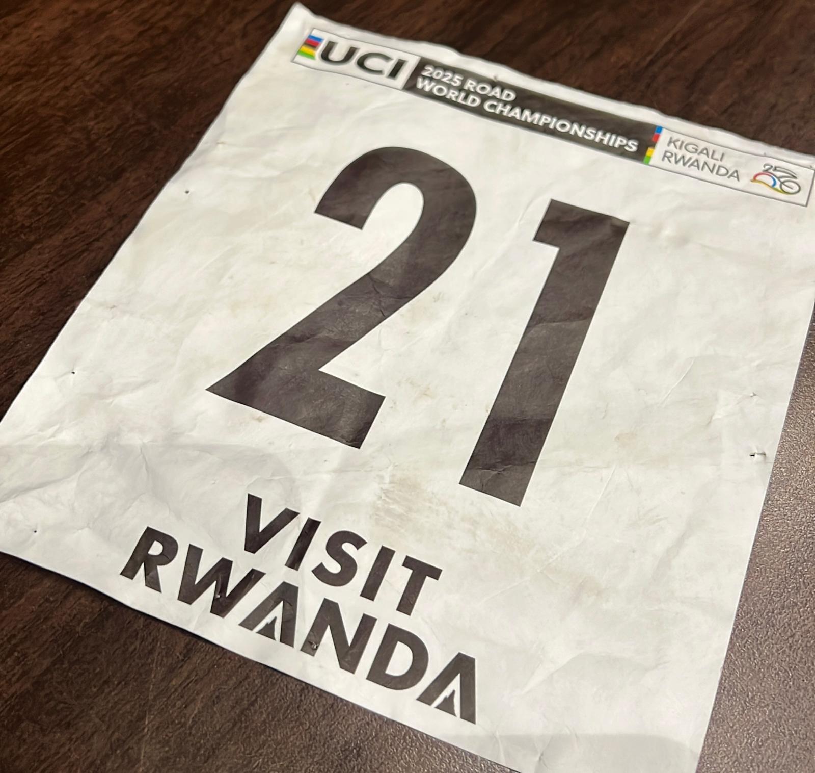 Regreso de nuevo a la zona de meta y ya está casi desmontado, pero aún les queda un día más. Recojo unos trozos de valla despedazados con los aros olímpicos -o el arcoíris- que seguro a algún amigo le gustará. Repito cena en el restaurante ciclista y me llevo de recuerdo el anterior maillot de la creciente selección de Ruanda. Un ciclismo que habrá aprovechado el evento y del que posiblemente salgan ciclistas procedentes de los que se extasiaron viendo al espectáculo detrás de la valla. Como Binian Girmay, el longilíneo eritreo del Intermarché con el que coincidí en el vuelo de vuelta Kigali-Entebbe-Estambul y todo un referente para los africanos y al que aproveché para saludarle reconociendo que conocía nuestra web. En el aeropuerto turco le vi alejarse camino de sus próximas citas y hacia su nuevo equipo 2026. Busco la puerta de embarque para Valencia. Es la A10, adeu -adiós- en valenciano. Adiós Ruanda o hasta pronto. Quién sabe porque ya pensamos en Canadá 2026.