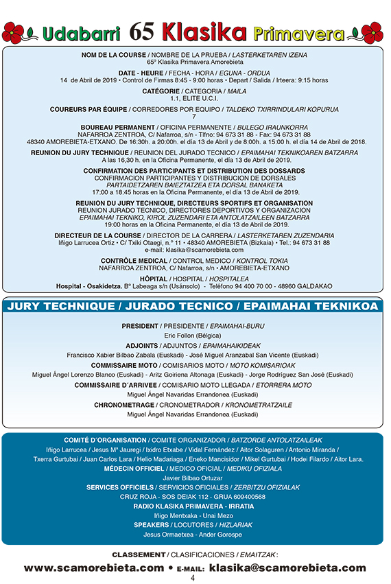 La 65ª edición de la Klasika Primavera -organizada por la SC Amorebieta- se presenta este domingo 14 de abril con un recorrido de 171.6 km., practicamente los mismos que en la última edición en la que se impuso el costarricense Andrey Amador con su compañero Alejandro Valverde a rueda.