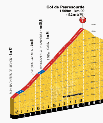 -Km 90.0 – Col de Peyresourde (1 569 m). 13.2 km de subida a 7% – categoría 1