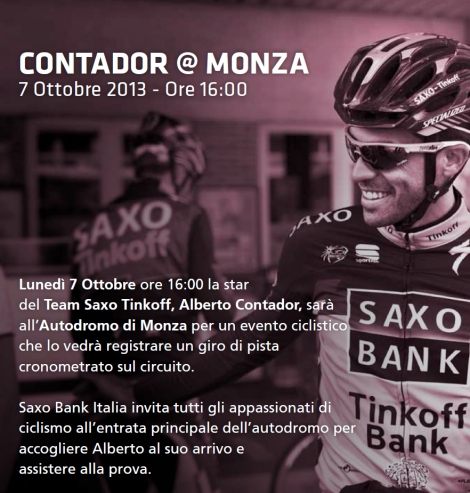 Alberto Contador tendrá el próximo lunes 7 -el día después de Il Lombardia- un día plagado de eventos. Será protagonista de un encuentro llamado “Ciclismo y Finanzas”, lo que le impedirá estar en la presentación del Giro de Italia 2014. La ubicación será en el mercado financiero italiano, Palazzo Serbelloni, en el Corso Venezia.