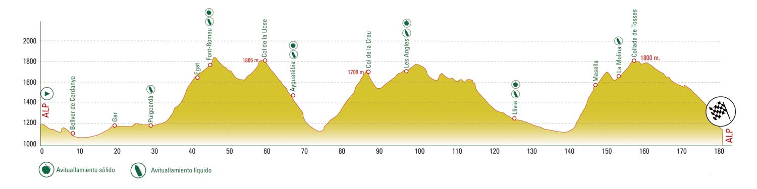Los 182 kilómetros de la ruta Endurance están pensados para todos aquellos participantes que quieran vivir una de las grandes marchas cicloturistas de los Pirineos. Este exigente y bello recorrido comparte los 141 km de la ruta Medial, pero con el añadido de un bucle final de 40 km que empieza con el ascenso a La Molina por el lado de Masella (una subida corta pero intensa) y continua hasta coronar la Collada de Toses. Una vez allí se emprende el camino de vuelta, muy rápido por el perfil siempre favorable, hasta el arco de meta de Alp, donde los finishers de la Cerdanya Cycle Tour podrán reponerse y acceder al servicio de masaje.