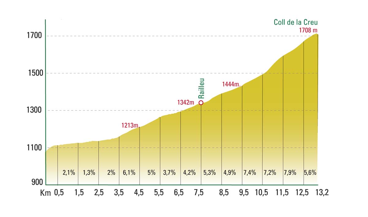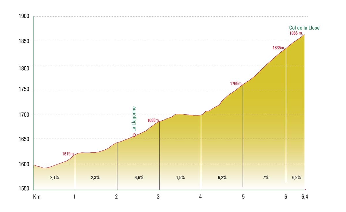 Después de unos kilómetros de descenso, carreteras reviradas, vegetación más alpina y absoluta calma, llegaremos a una ascensión dura… pero espectacular. Son unos 4km con rampas del 10 y 11%. A destacar que la carretera siempre sube, excepto de vez en cuando que hay pequeños llanos donde podremos recuperar las piernas para seguir disfrutando de la ascensión. La llegada a la cima, a 1.708m, es un premio para la vista y la bajada hasta Les Angles, un premio para las piernas.