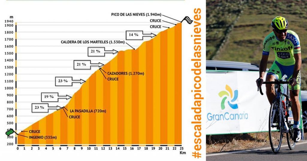 Serán 23 kilómetros de ascensión constante, hasta alcanzar el Mirador del Pico de Las Nieves, el punto más alto de la Isla de Gran Canaria, con 1.949 metros. Una ascensión con muros del 23 % y kilómetros interminables por encima del 15%. Como dice la canción de La Cicloturista: “quien lo corona el cielo toca” y se puede decir que se ha doctorado en la amplia asignatura del cicloturismo.