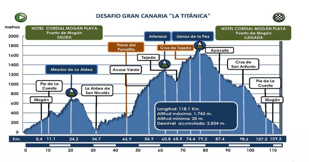 Y lo ha hecho a lo grande, con la celebración de la cuarta edición del Desafío Gran Canaria “La Titánica”, una prueba que a pesar de su corta edad, se ha convertido en un referente cicloturista no solo a nivel nacional, sino también internacional. Una prueba no muy larga, 118 kilómetros, pero con un desnivel acumulado de casi 3.000 metros, por carreteras endiabladamente retorcidas y espectaculares, de subidas interminables, que confieren al recorrido una dureza extrema y un encanto especial.