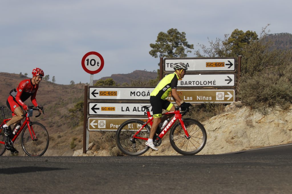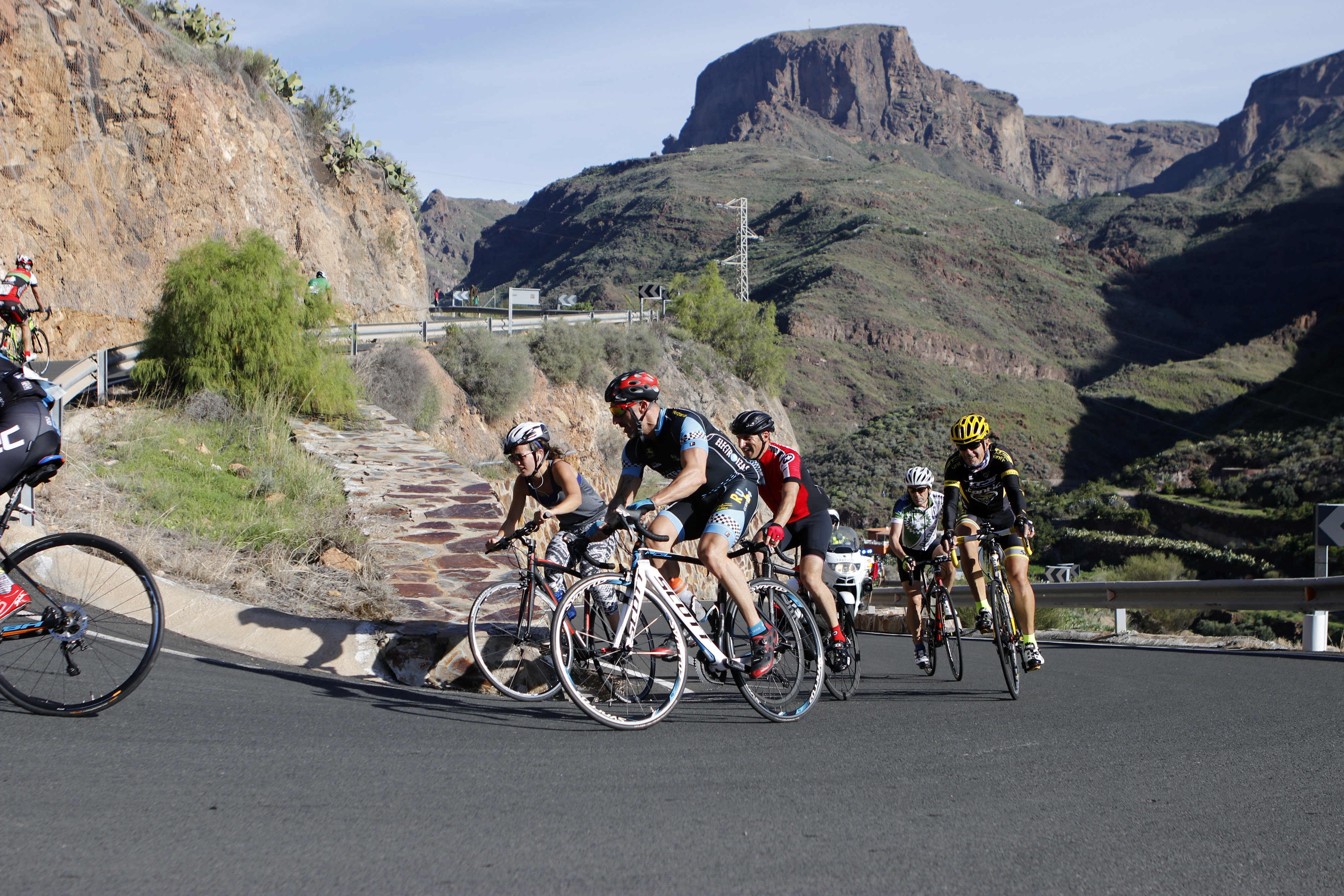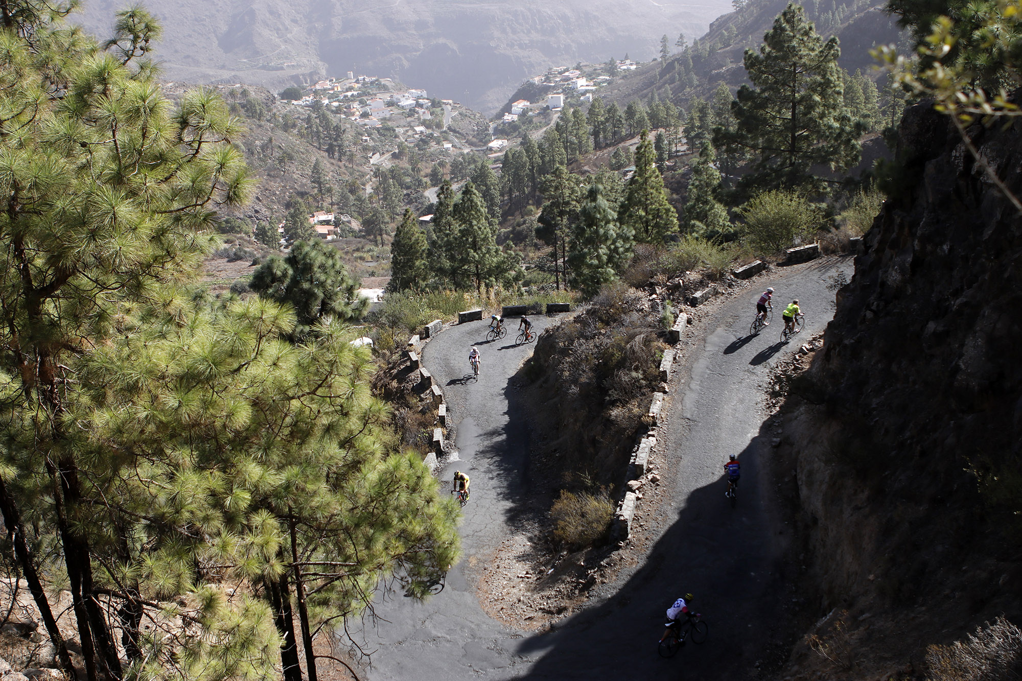 Todavía quedaban 11 kilómetros para coronar el puerto y llegar hasta la Villa de Artenara. La carretera seguía mirando al cielo azul, al igual que los ciclodeportistas con duros rampones del 15 % y algún kilómetro por encima del 11 %. Tras coronar y sortear un giro de casi 90 grados, el recorrido continuaba hacía Tejeda, con El Roque Bentaiga y Los Tres Reyes Magos como testigos privilegiados del paso de los ciclistas. En este tramo se han acrecentado las hostilidades entre los primeros, formándose dos grupos que poco después paso a tres.