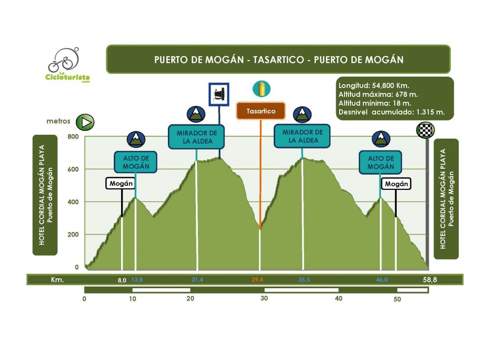 En la primera jornada el pelotón multicolor se desplazará hasta Tasartico, una etapa estrenada el año pasado y que debido a la extraordinaria acogida que tuvo vuelve a formar parte de esta edición. A la ida los ciclistas deberán ascender hasta el Mirador de La Aldea, previo paso por el Alto de Mogán, una pendiente larga y tendida, que siempre acaba pasando factura y desperdigando al pelotón. A la vuelta, tras el avituallamiento, volverán sobre sus pasos, pero tocará escalar hasta el mismo punto sorteando rampas del 14 % y un infernal kilometro con una media superior al 12 %.