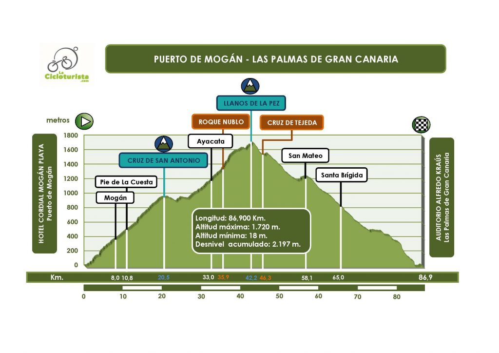 Serán 87 kilómetros que en una primera parte de ascensión continua llevará a los cicloturistas hasta la Cruz de Tejeda, para a continuación encarar una pronunciada bajada pasando por Las Lagunetas, San Mateo y Santa Brígida para desembocar en Las Palmas de Gran Canaria, estando marcado el punto final en el Auditorio Alfredo Kraus, que ya fue salida de una etapa de la Vuelta Cicloturista en el año 2008.