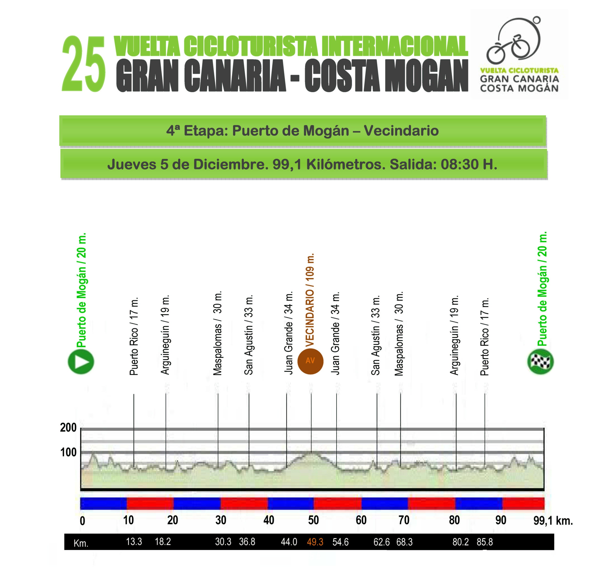 Mañana se disputará la cuarta etapa de la Vuelta, la más larga, casi 100 kilómetros, paralelos a la costa y sin dificultades montañosas. El avituallamiento estará ubicado en Vecindario.