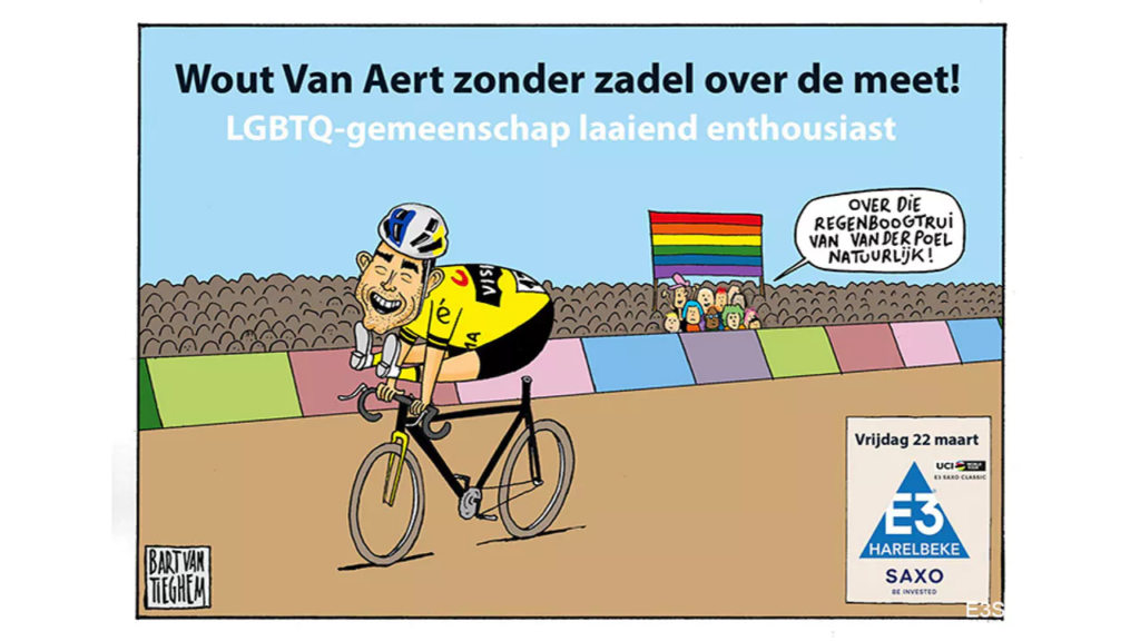 Por último, el autor de dicho cartel, Bart Vantieghem, explicó su versión de lo sucedido. «Es un viejo cliché estúpido sobre los gays, pero en el globo de diálogo ves que los gays dicen algo completamente diferente. No prestan atención a la falta de silla de Van Aert en absoluto, pero sí tienen buen ojo para la bandera arcoíris en la camiseta de Van der Poel. No voy a censurarme como dibujante, pero puedo entender que la organización del E3 esté un poco conmocionada por la conmoción, a pesar de que tienen un poco de tradición de carteles controvertidos. No he recibido ninguna reacción negativa de la comunidad LGBT, al contrario. Pueden reírse de ello. También ven que la comunidad LGBT en la caricatura en realidad es la más inteligente. No sé si quieren continuar ahora. Todavía no he tenido noticias de la organización», dijo el dibujante a Radio 2.