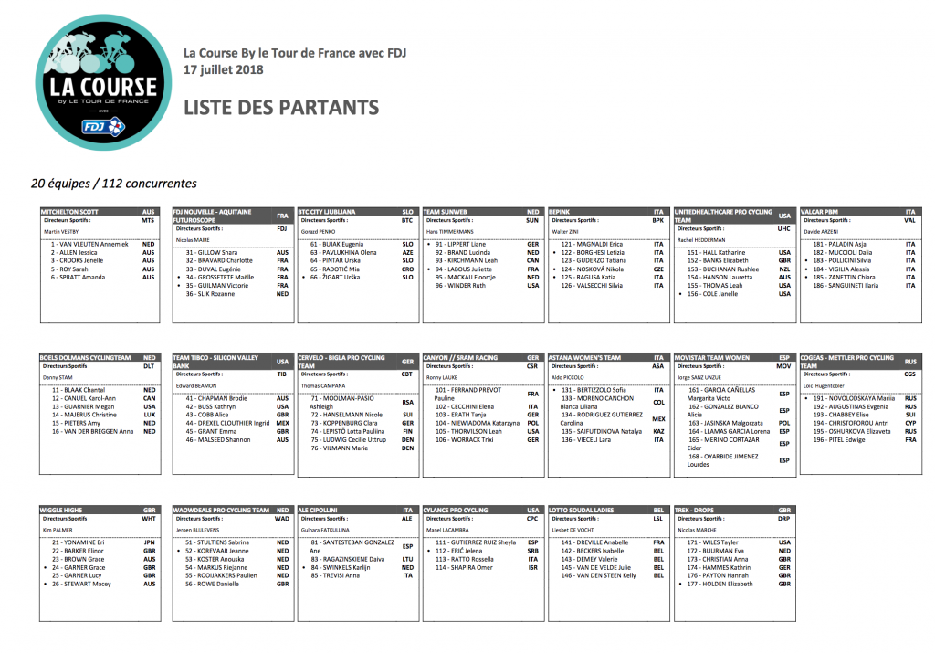 Para esta ocasión, los organizadores de La Course han seleccionado un total de 20 equipos para formar parte de la quinta edición de la carrera: Ale, Astana, Bepink, Boels, BTC City Ljubjana, Canyon, Cervelo, Cylance, FDJ, Lotto, Mitchelton, Sunweb, Tibco, Virtu, Trek, UnitedHealthcare, Valcar, Waowdeals, Wiggle y Movistar, que será este año el único conjunto español presente.