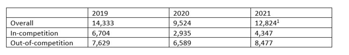Mientras la pandemia en curso requería flexibilidad y vigilancia, la ITA mantuvo un alto nivel de pruebas fuera de la competición. En total, la ITA recogió cerca de 13.000 muestras, de las cuales casi 8.500 se recogieron fuera de la competición.
