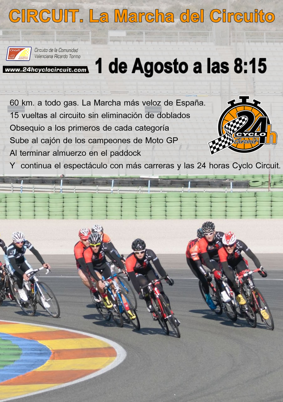 Entre los eventos que se celebrarán el fin de semana del 31 de julio al 2 de agosto de 2015 en las 24 Horas Cyclo Circuit en el circuito del mundial de Moto GP, Ricardo Tormo de Cheste, el sábado 1 a las 8:15 horas, se celebrará la marcha del circuito “CIRCUIT”. Pedalea en el circuito.