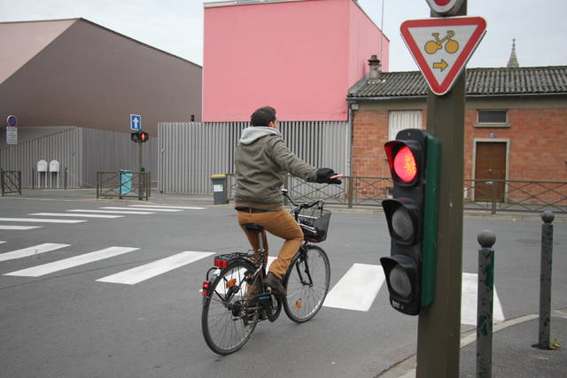 - la señal francesa de permitir el giro a la derecha para bicicletas en algunos semáforos