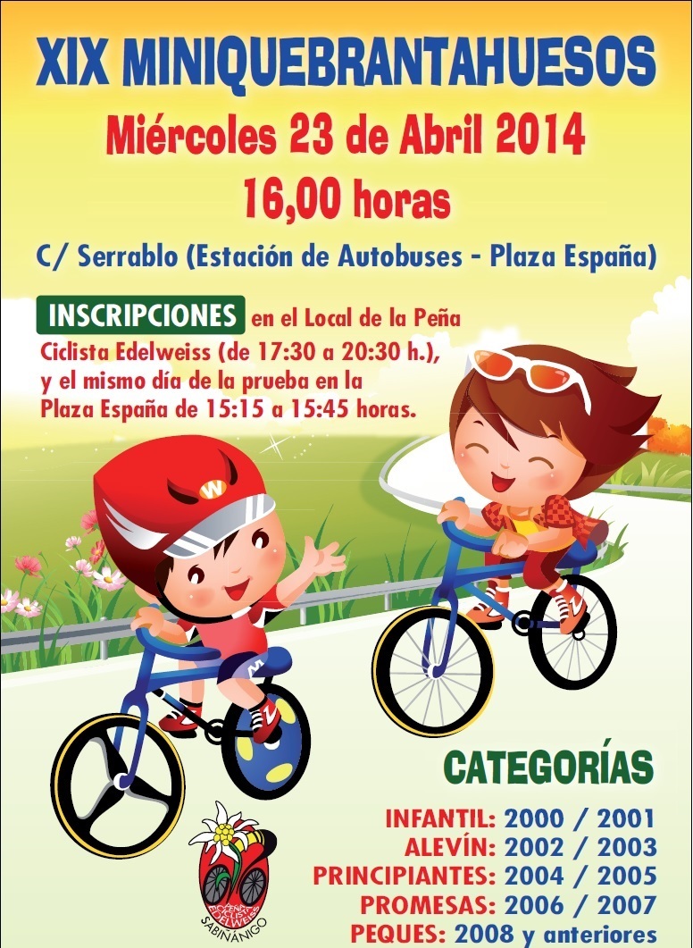 La PC Edelweiss organiza una nueva edición de la Mini-Quebrantahuesos, que se celebrará el miércoles 23 de abril, a partir de las 16 horas, en la Calle Serrablo (estación Autobuses a Plaza de España ) de la localidad de Sabiñánigo, zona que durante la celebración de las pruebas permanecerá cerrada al tráfico, con la colaboración de la Policía Local