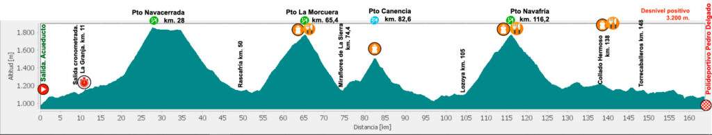 La SALIDA se realizará a las 08:00 horas desde la Plaza de la Artillería, junto al Acueducto, continuando por Avda. del Padre Claret, y será neutralizada hasta la Granja de San Ildefonso. Desde la rotonda situada en esta población (km. 11) se realizará la salida del tramo cronometrado, circulando por los puertos de Navacerrada, Morcuera, Canencia y Navafría y las localidades que figuran en el Rutómetro detallado a continuación, hasta la LLEGADA situada en Cl Dámaso Alonso, s/n – Pabellón Deportivo Municipal Pedro Delgado.