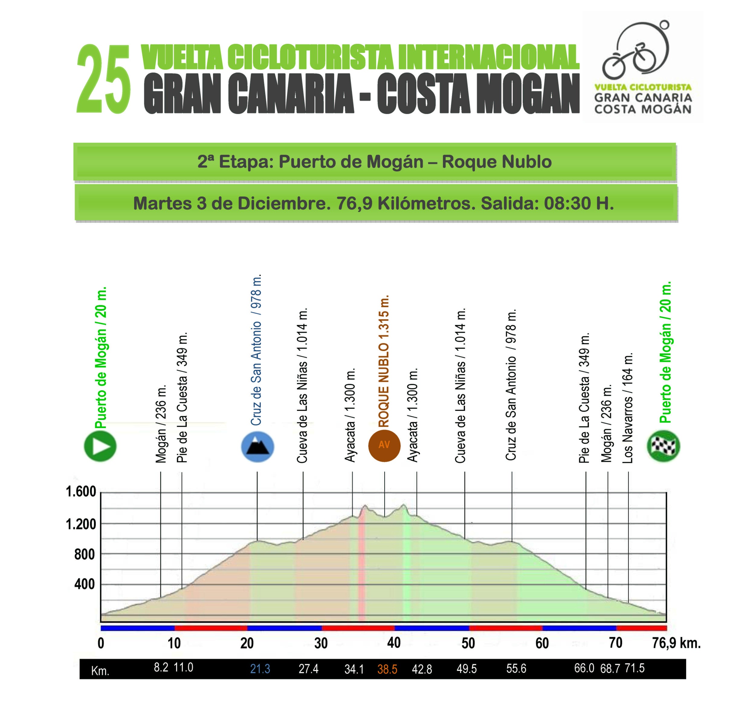 La 25ª Vuelta Cicloturista Internacional Gran Canaria-Costa Mogán ha vivido hoy su segunda jornada. En principio estaba previsto que se disputase la etapa hasta el Roque Nublo, pero las lluvias en la zona de la cumbre y la espesa niebla a primeras horas de la mañana desaconsejaban esta opción. De ahí que la organización se reuniera con los servicios de seguridad y la Guardia Civil de Tráfico y tras las oportunas autorizaciones, decidiera cambiar la etapa, de manera que hoy se ha celebrado la etapa prevista para mañana y mañana se ascenderá hasta el Roque Nublo.