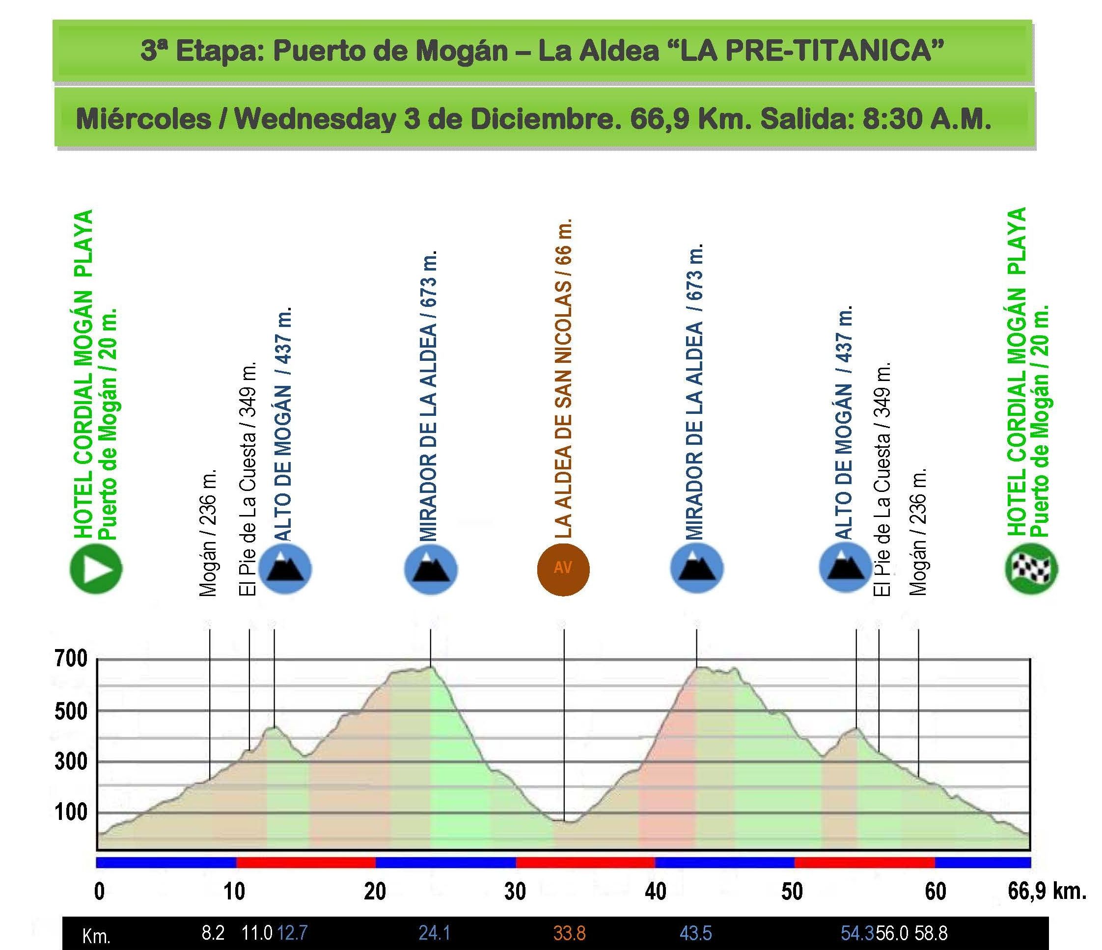Todos los integrantes del pelotón cicloturista partirán a las 8 y media de la mañana rumbo a La Aldea de San Nicolás. En el camino tendrán que sortear el Alto de Mogán y El Mirador de la Aldea con rampas este último del 17 %. La Plaza de la Alameda de La Aldea recibirá a los ciclodeportistas y allí estará instalado el control de avituallamiento.