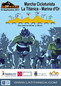 Después del parón en 2016, la Marcha Cicloturista La Titánica regresa el próximo sábado 16 de septiembre de 2017 con salida y meta en Marina D’Or (Oropesa del Mar / Castellón), con un formato diseñado y pensado para todos los ciclistas, «porque sabemos que cada uno de vosotros tiene un concepto y una forma diferente de ver y vivir una marcha cicloturista», informa la organización.