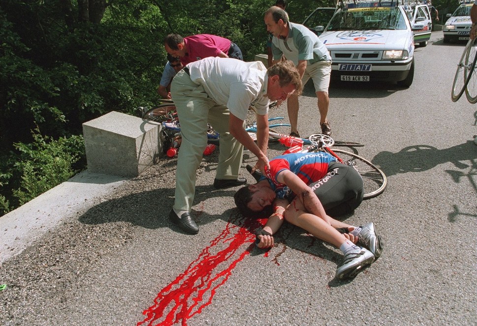 En el descenso del primero de ellos, una caída afectó a siete corredores, entre los que se encontraba el otrora campeón olímpico amateur en los Juegos Olímpicos de Barcelona´92, el italiano, Fabio Casartelli. Las imágenes eran preocupantes. El transalpino, encogido en el suelo, y bañado por un charco de sangre, tras haberse golpeado con el suelo y, posteriormente, con uno de los quitamiedos de piedra. Inmóvil, inerte.