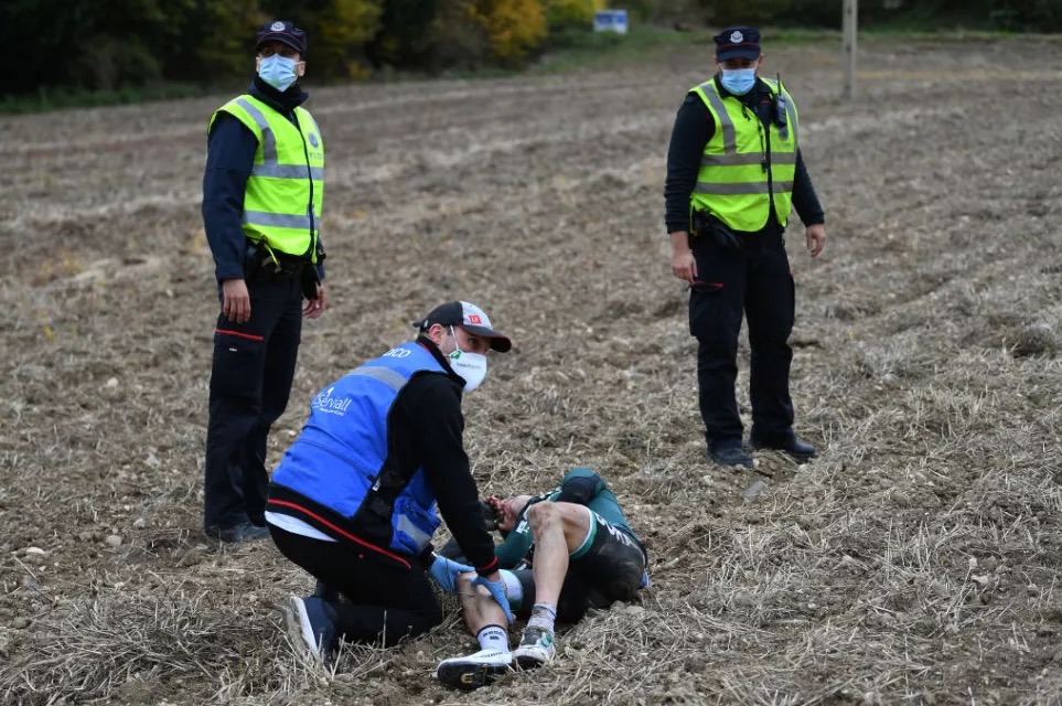28 octubre. Faltaban unos 60 kilómetros para la línea de meta de la 7ª etapa de la Vuelta a España cuando Jay McCarthy (Bora-hansgrohe) apareció en mitad de un campo junto a la carretera por la que transitaba la carrera. El australiano sufrió una fuerte caída en plena recta y cuando más rápido se rodaba que, por fortuna “dadas las circunstancias, no ha provocado lesiones graves”, tal y como explica el médico de su equipo.