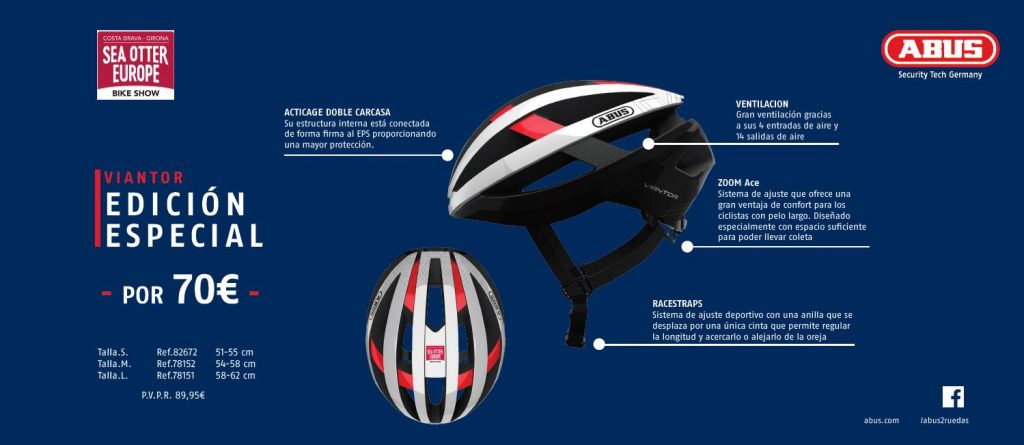 Con este consolidado acuerdo, Abus saca a la luz su fantástico Viantor en edición especial Sea Otter Europe, para que todos los participantes puedan lucir un casco de primera en La Brava y en todas sus salidas por carretera, por un precio especial de 70€. Una oferta irrechazable para un casco que tiene un valor de 89€.