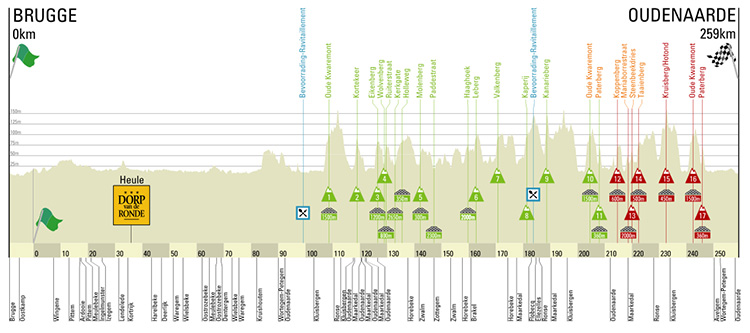 Altimetrías interactivas de las 15 cotas de la Vuelta a Flandes, que los corredores ascenderán en 17 ocasiones con tres subidas al Oude Kwaremont y dos al Paterberg. Un recorrido de 259 kilómetros entre Brujas y Oudenaarde, con unos primeros 100 llanos y los últimos 159 donde comenzará la interminable sucesión de ascensos y descensos y tramos adoquinados que conforman la dureza del segundo monumento de la temporada 2014