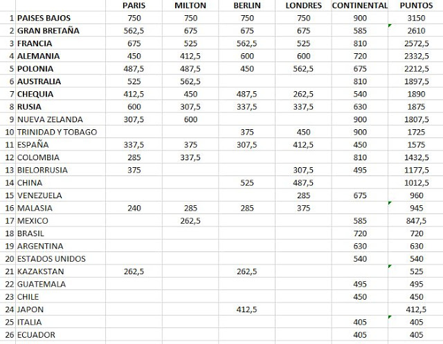 En cuanto a Colombia tiene más difícil superar el corte, aunque es casi seguro que pase a España cuando sume su tercer resultado en alguna de las dos pruebas que quedan. Porque es cierto que España puede aumentar su puntuación, pero a costa de mejorar las posiciones ya conseguidas en Berlín o París.