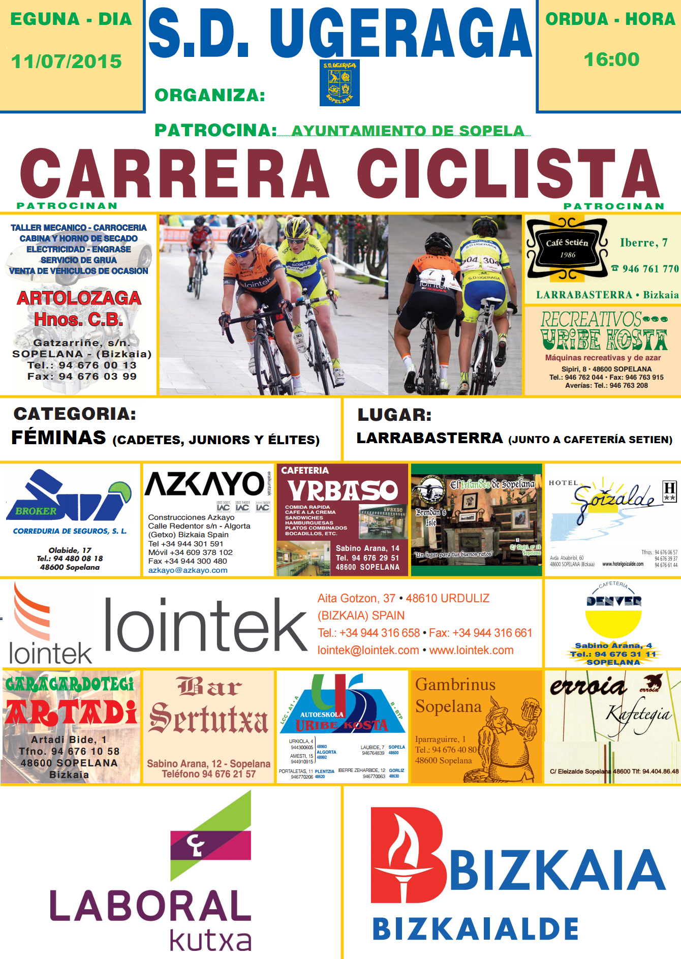 La carrera dará comienzo a las 16 horas desde la rotonda de salida de Larrabasterra, para seguir por el alto de Andraka, Villela, Mungia, Gatika y llegada a Larrabasterra, donde tras esta primera vuelta las cadetes finalizarán su carrera después de haber completado 33,7 kms. Las júnior y élite continuarán por este mismo circuito hasta completar los 84,7 kms. previstos.