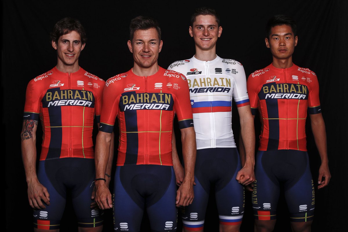 Iván García Cortina, con Haussler, Mohoric y Mei Yin Wang © Team Bahrain Merida / Bettini Photo