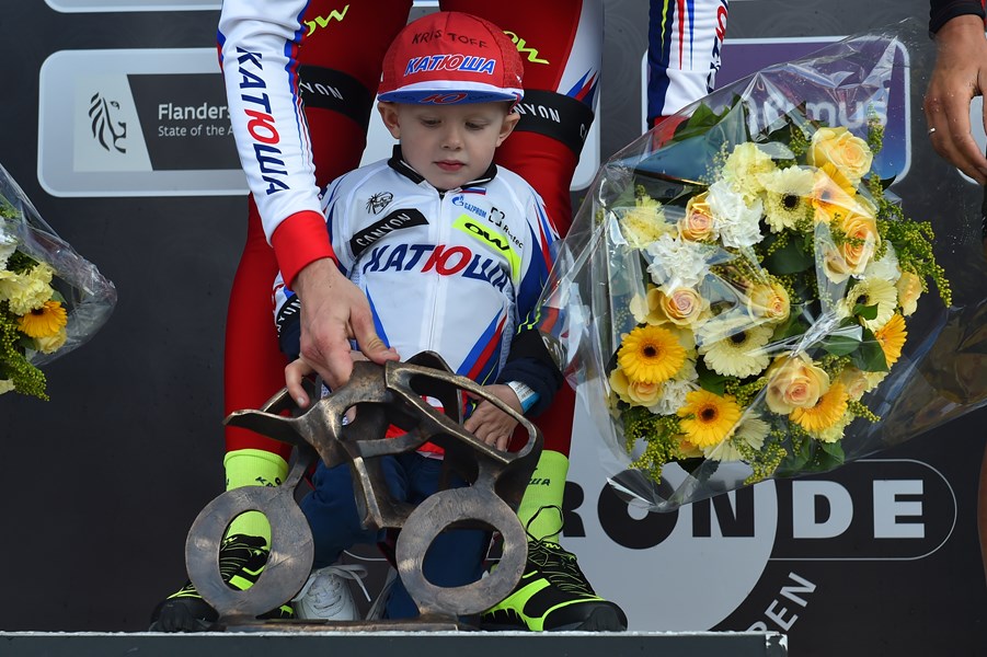 Cada vez es más habitual ver a los ganadores de los grandes eventos ciclistas subir al podio acompañados de sus hijos. La juventud de los protagonistas hace que esos ‘actores secundarios’ sean, también, niños muy pequeños que no comprenden la solemnidad y la importancia de lo que ocurre a su alrededor, regalando por ello algunas de las imágenes más simpáticas del día. Algo así sucedió ayer con el hijo de Alexander Kristoff, Leo, que se convirtió, con sus muecas y travesuras, en el protagonista de la entrega de trofeos.
