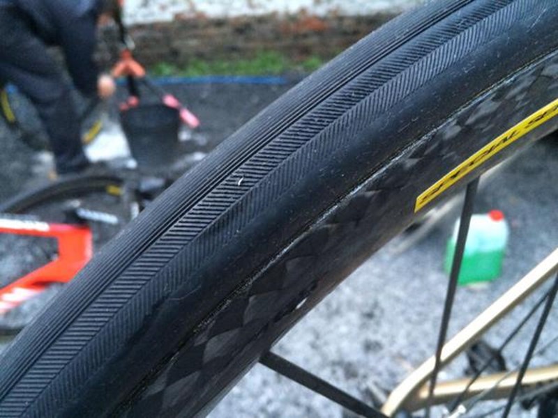 Ganar la Vuelta a Flandes está sólo al alcance de corredores enormes, pero requiere también una buena dosis de suerte. El que no se lo crea, que se lo pregunte a Alexander Kristoff que rozó el drama de quedarse sin victoria. Seguramente, el noruego no lo supo hasta después de cruzar la meta, pero sus ruedas estuvieron muy cerca de pinchar, como muestra esta imagen que subió a Twitter Philippe Maertens, uno de los responsables de prensa del equipo Katusha, mostrando uno de los varios trozos metálicos que se incrustaron en el tubular de Kristoff.